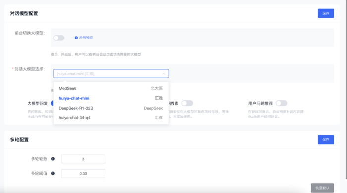 · 兜底策略:设置是否开启大模型兜底回答,以及是否需要用户确认后再调用大模型