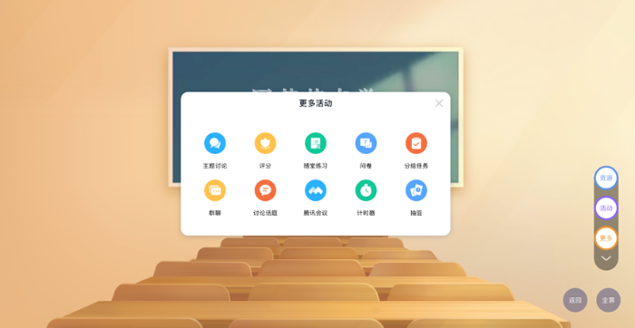 · 课堂互动:签到、选人、抢答、投票、主题讨论、分组任务等