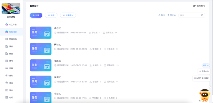 · 任务点设置:支持视频、文档、线下课堂、AI实践等17种任务点类型