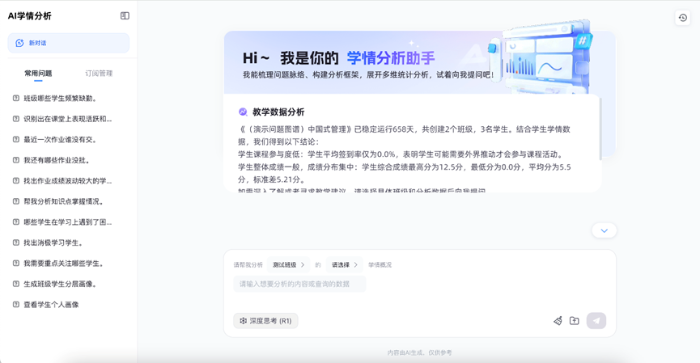 · AI学情分析:教师可向学情分析助手提问,获取数据分析结论与教学建议