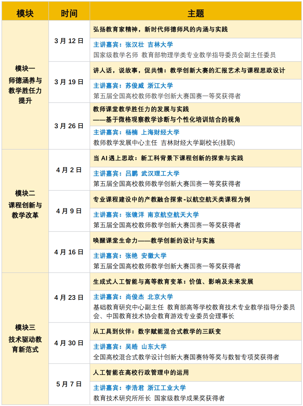 “智教新篇:数字化浪潮下的教学重构与价值探索”,聚焦教育数字化转型的纵深阶段,通过“师德涵养与教学胜任力提升”“课程创新与教学改革”“技术驱动教育新范式”“学术成长与成果孵化”四大核心模块,系统回应新时代教师发展的全面需求。