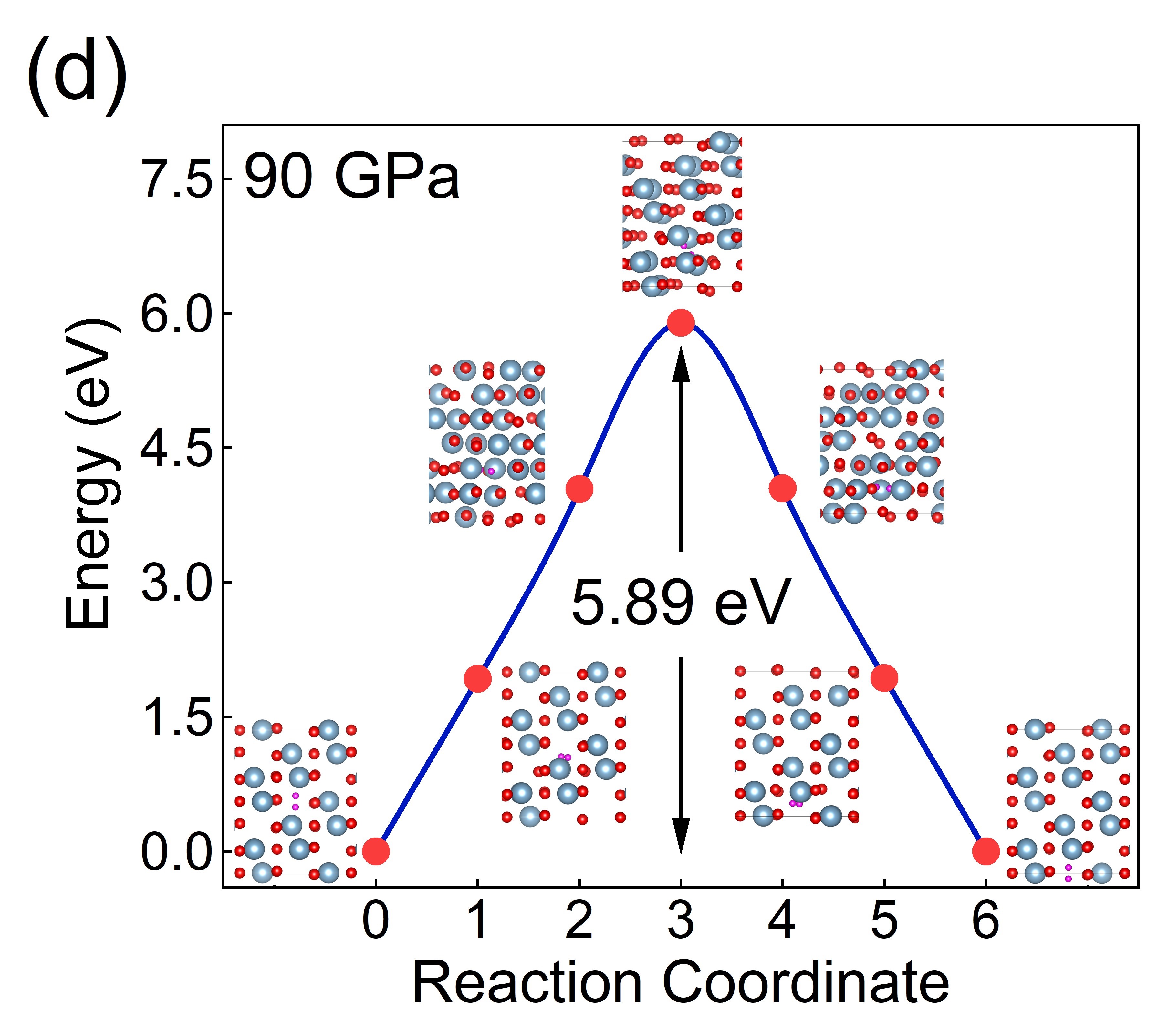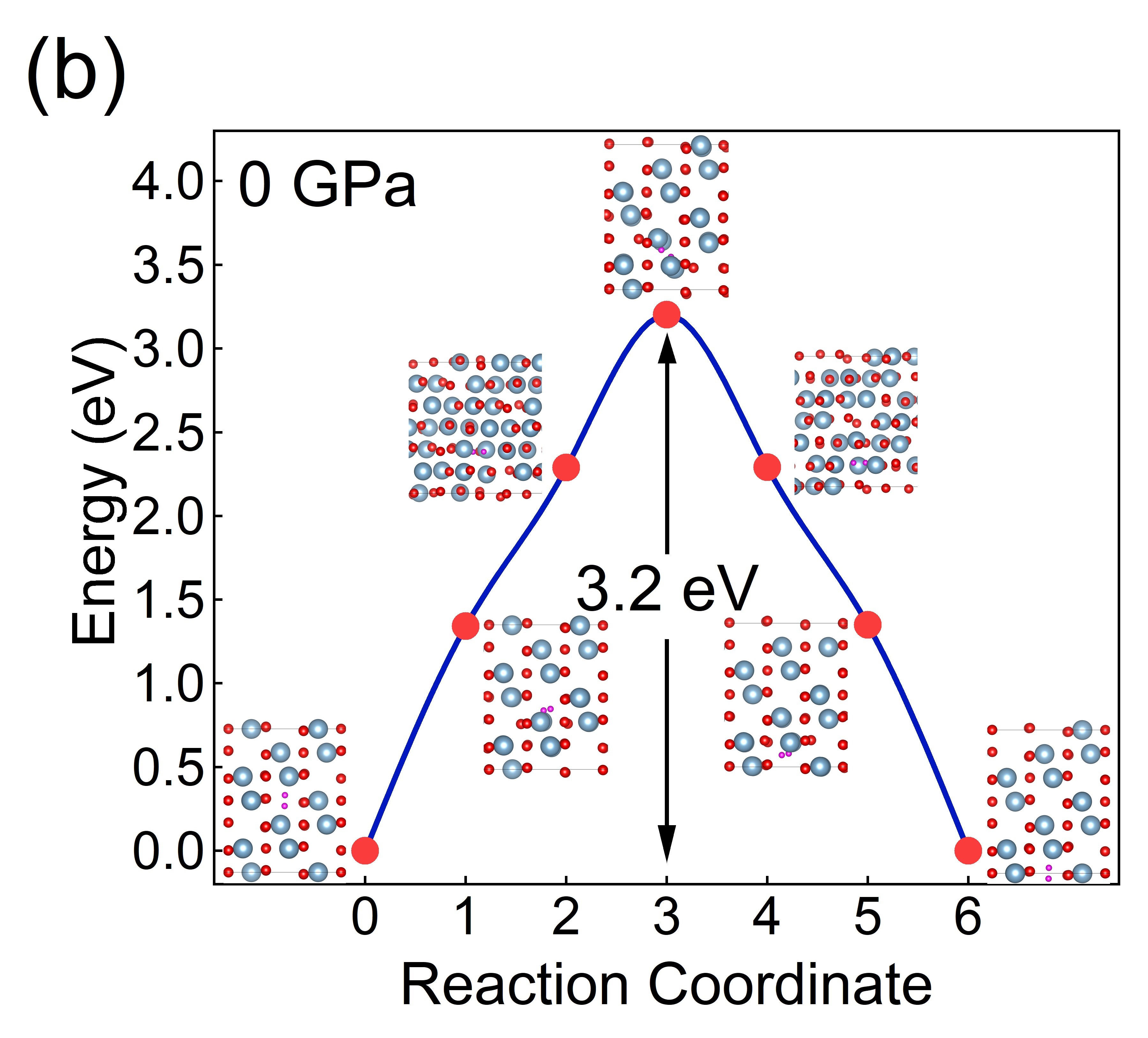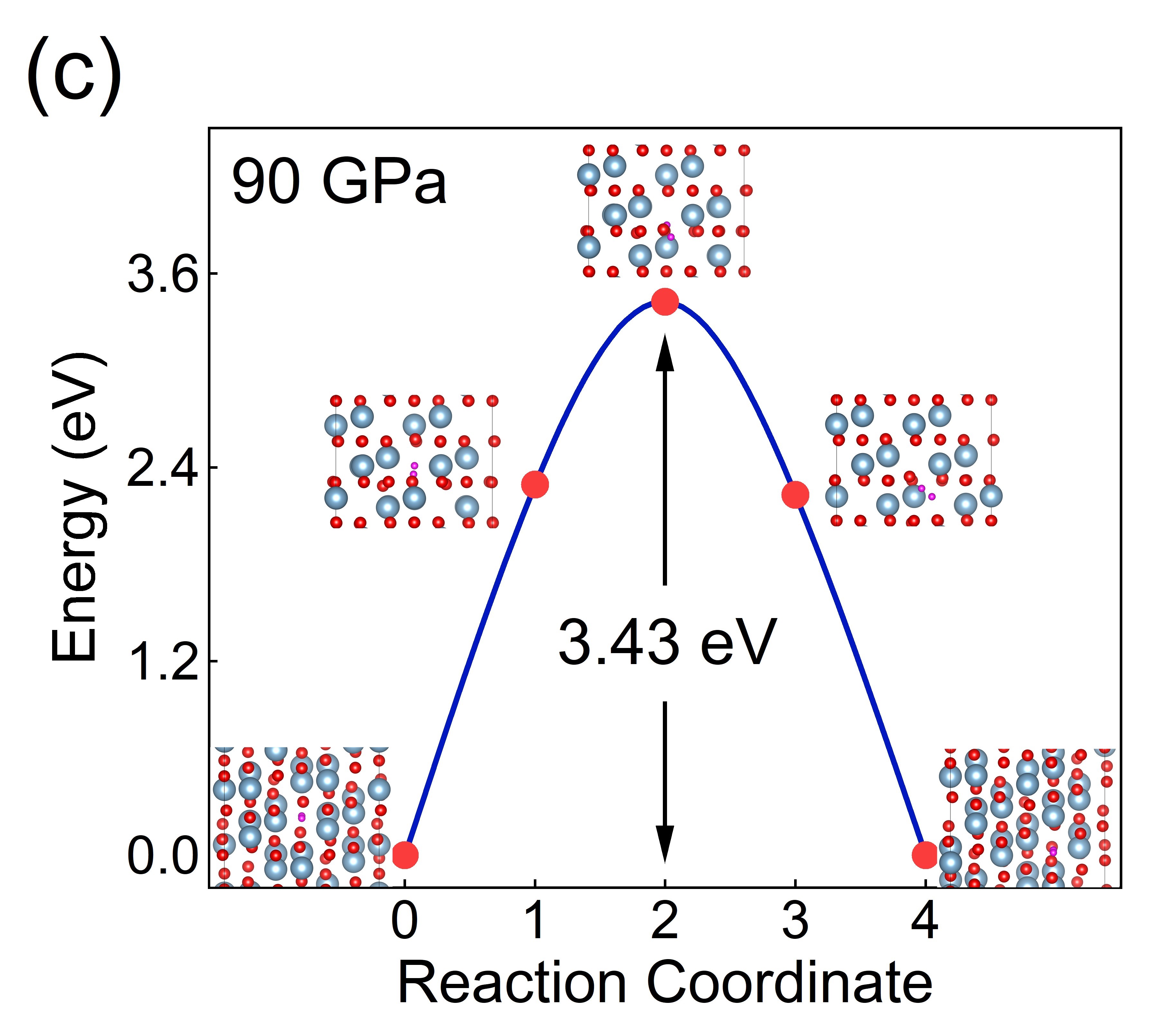 中国地质大学(北京)李林副教授研究团队,运用第一性原理理论结合CI-NEB方法,系统研究压力对刚玉中氢扩散行为的影响。研究的计算工作基于密度泛函理论(DFT),通过维也纳从头算模拟软件包(VASP)执行。研究采用了PBE-GGA交换关联泛函和PAW赝势方法。模拟体系为一个2×2×1的刚玉超晶胞,包含72个氧原子和48个铝原子。为精确获得迁移能垒,研究使用了CI-NEB方法来定位初始态和末态之间能量路径上的鞍点。为了计算氢在不同温度和压力下的扩散系数,研究通过第一性原理分子动力学(AIMD)模拟来确定氢的尝试频率。取得以下主要认识: