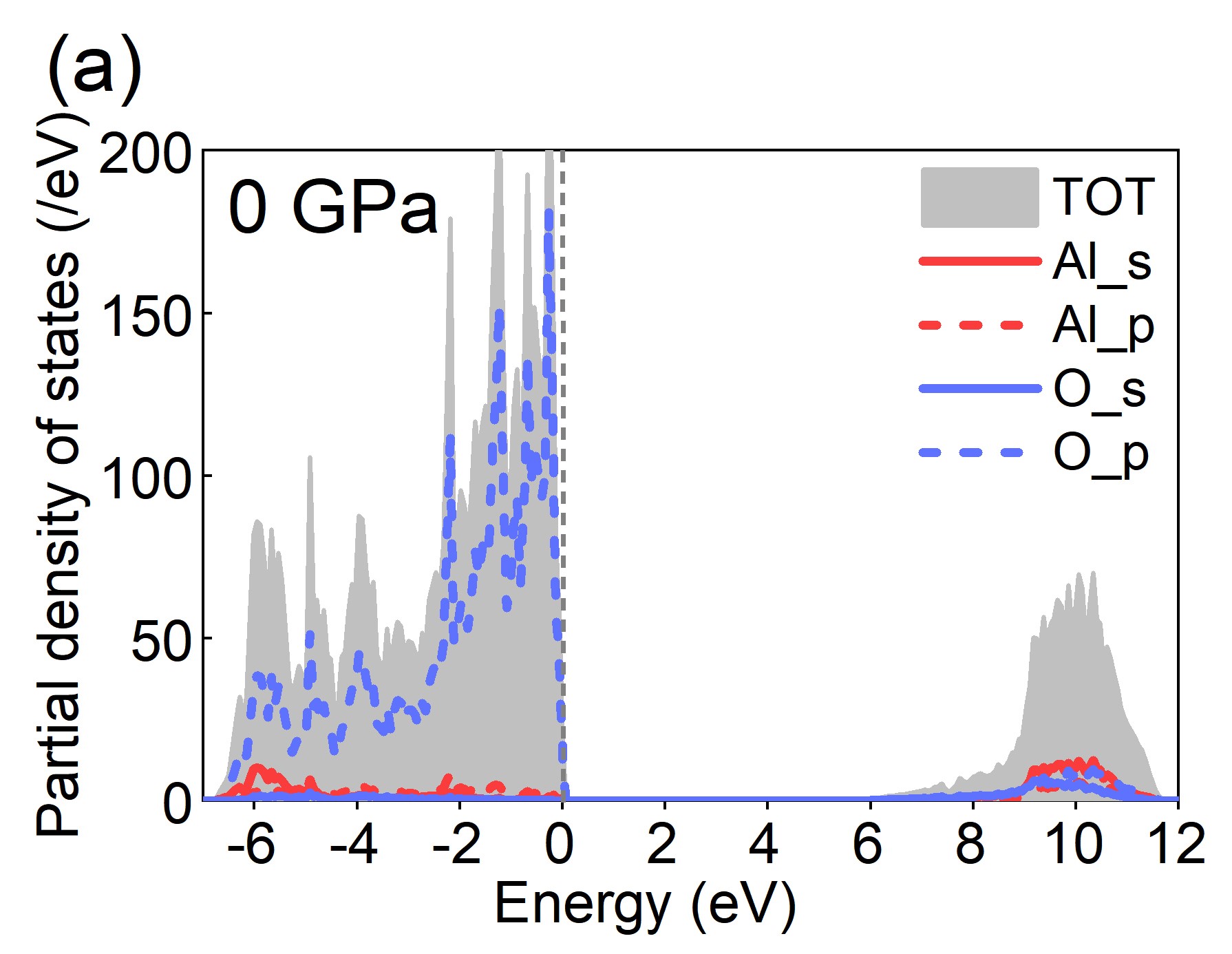 在0 GPa下,H原子沿最低能量路径扩散的能垒为1.01 eV(图2a, b, c)。随着压力从0 GPa升高到100 GPa,该能垒几乎呈线性增长至1.77 eV(图2d)。电子性质分析表明,含氢的刚玉表现出一定的金属性(图3a, b, c, d, e, f)。