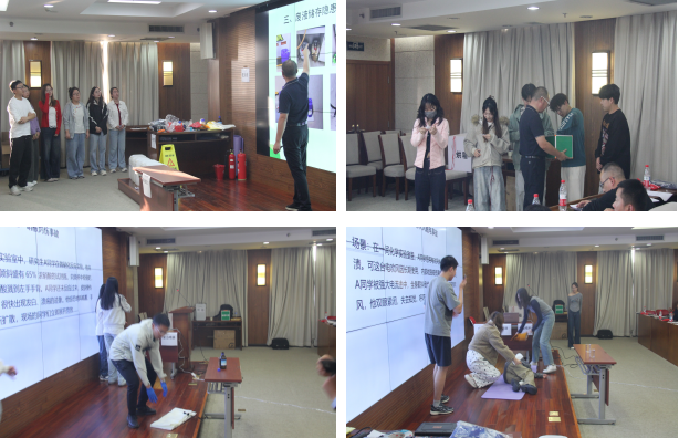 本次训练营由埃德伯格公司提供专业支持,特邀两位资深培训老师担纲指导。活动采用 “理论奠基、实战主导”的模式。在简明的理论讲解后,实战演练环节精心设计,针对性极强:负责第1至3组(触电、烫伤、割伤事故)的红十字会李老师,侧重于培训学生的自救与互救技能,将专业的医疗急救知识融入实验室场景。负责第4至8组(电池着火、硝酸灼伤、危废泄漏事故)的吴老师,则着重锤炼学生的现场应急处置能力,面对模拟的火情与化学品泄漏,指导学生如何规范、高效地控制险情。