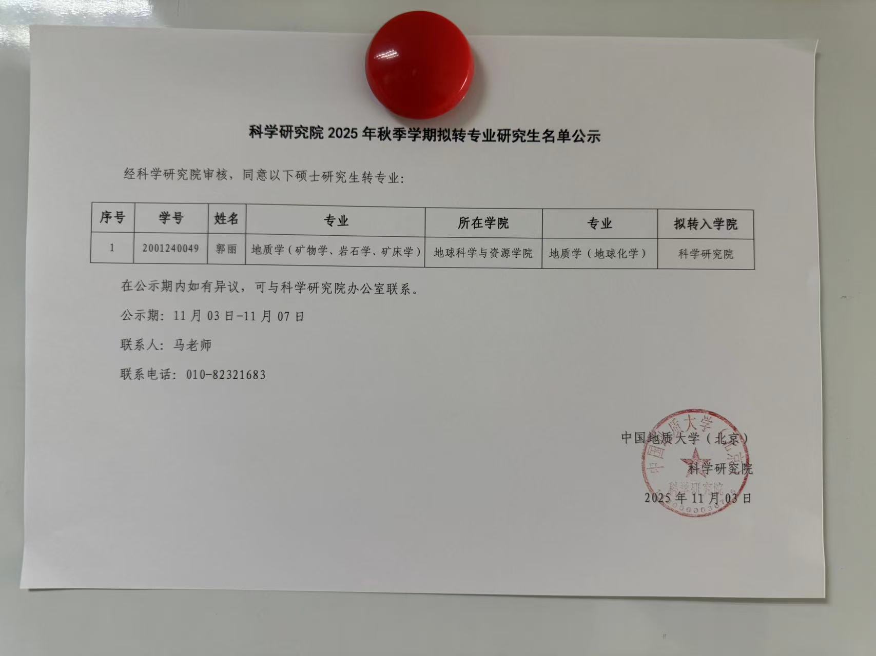科学研究院2025年秋季学期拟转专业研究生名单公示