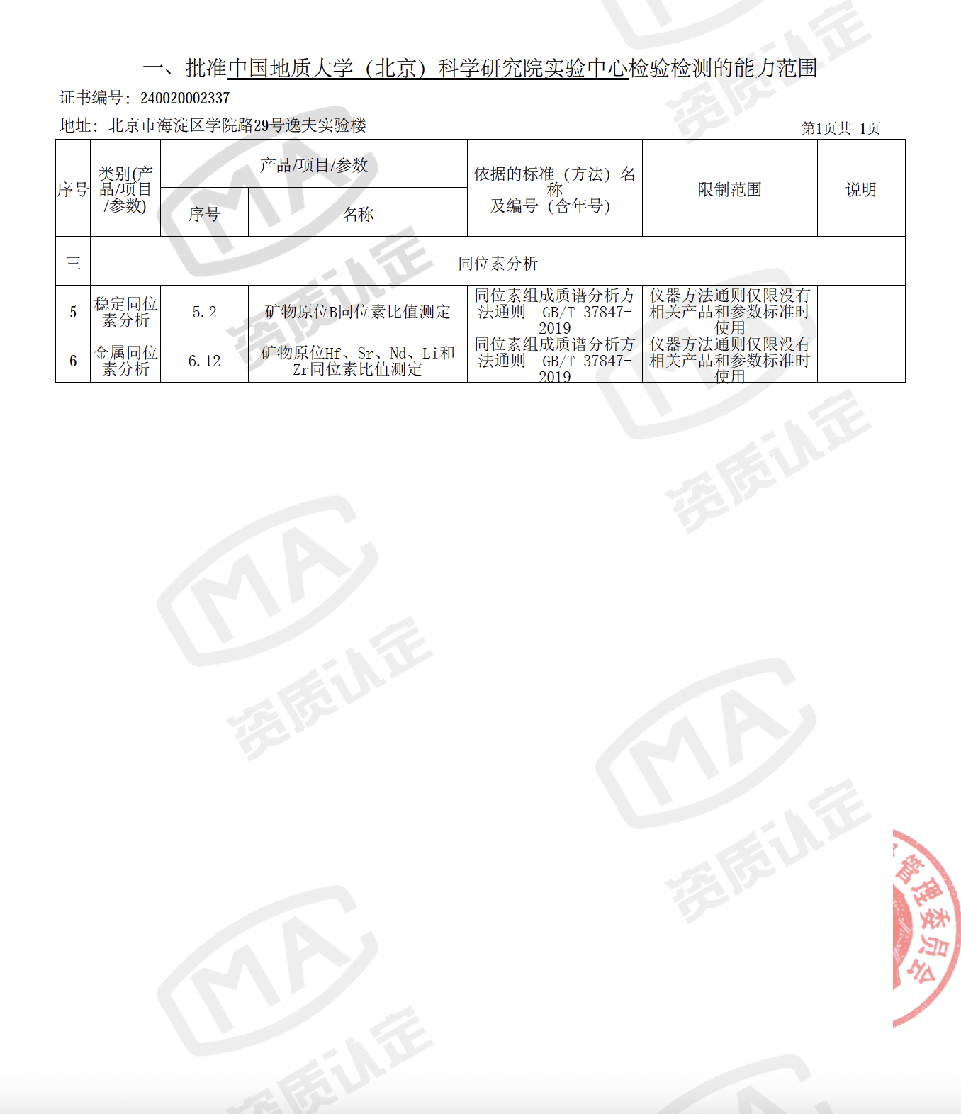 新增检测能力“5.2矿物原位B同位素比值测定”和“6.12矿物原位Hf、Sr、Nd、Li和Zr同位素比值测定”,是在原有检测能力“6.9矿物原位Hf同位素比值测定”的基础上,新增了B、Sr、Nd、Li和Zr共计5个元素。
