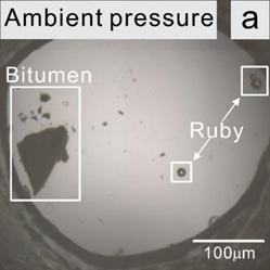 图1 样品腔内的初始装样状态。显微照片显示了沥青颗粒与红宝石在常温常压下的分布,背景为液态水。