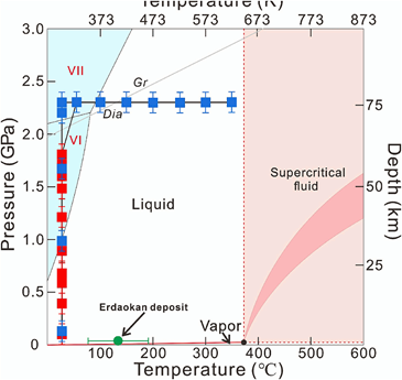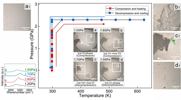 为了模拟成矿流体的演化环境,实验设定了特定的温压路径:首先在常温下加压至~1.8 GPa,随后加热至623 K并恒温,最后进行降温降压。在此过程中,水分子在不同温压条件下的相变(如Ice VI/VII相的转换)被作为监测实验体系物理化学状态的重要指标。