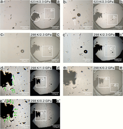 图3 加热-冷却循环中的显微结构演化。(a) 623 K/2.3 GPa:沥青在亚临界流体中发生部分溶解,边缘出现明显的扩散晕,表明其转化为可流动的流体相;(b) 523 K/2.3 GPa:随着温度降低,流体中开始成核并析出球状沉淀物;(e) 298 K/0.2 GPa:降至常温低压后,沉淀物形成不规则团簇。
