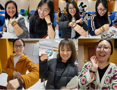 活动现场暖意融融,氛围轻松愉悦。老师们齐聚一堂,在专业老师指导下,充分发挥创意与巧思,专注于每一个细节。从选材、搭配、拼接,手法娴熟的将一颗颗珍珠、一根根丝线巧妙组合,指尖流转间,原本普通的材料化作独一无二的手链、项链与手串。