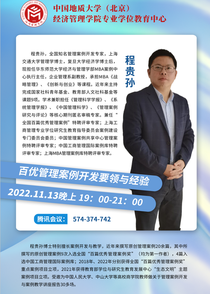 学术报告通知——程贵孙博士:百优管理案例开发要领与经验