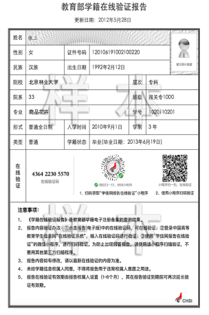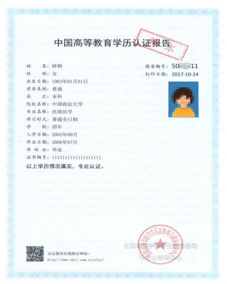 《教育部学籍在线验证报告》和《教育部学历证书电子注册备案表》样例: