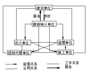 跟踪审计与建设工程中各相关单位的关系可以用图形象所示,由此图可以看出,跟踪审计的职能就是监督,服务,在监督中服务,在服务中监督,有效控制工程造价,有效地改善、促进工程管理,不能替代监理进行工程管理,不是替代建设单位进行领导决策。