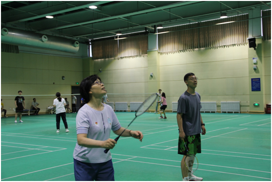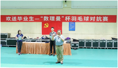 之后总裁判长郑志远老师宣读比赛规则,并宣布“数理曼”杯羽毛球对抗赛正式开始。本次比赛由老师与毕业生组队双打,共有9个小组36支队伍进行比赛。本着“友谊第一,比赛第二”的原则,同学和老师们“打成一片”,进行了一场场畅快淋漓的球赛,在球场上挥洒汗水。