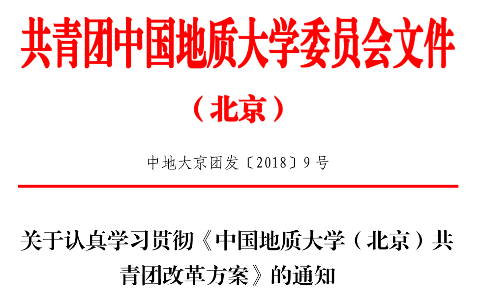 为深入贯彻落实《高校共青团改革实施方案》,切实加强和改进我校共青团各项工作,推进我校共青团改革创新,经党委常委会审议通过,《中国地质大学(北京)共青团改革实施方案》于2018年3月28日发布,我校共青团改革进入攻坚期,方案从改革优化机构设置和运行机制、改革健全基层组织制度、改革创新工作方式方法、改革完善团干部选用培养制度、改革强化保障支持等5个方面,明确了18条改革举措,各级共青团组织积极学习文件内容,结合自身情况分别制定了改革实施方案,并按照文件要求严格进行改革。截止2018年底,所有改革举措已基本落实完成。
