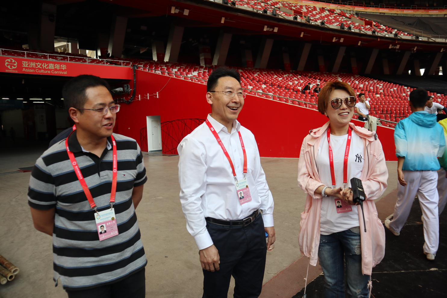 5月9日,我校党委副书记姜恩来在校团委负责同志陪同下,专程来到鸟巢慰问参演学生。嘉年华导演组接待了姜书记一行,给予了我校学生听指挥,素质高,肯吃苦,专业化的高度评价。姜书记指出,同学们有幸代表学校,代表国家参与此次活动,是社会各界对我校艺术教育发展成果的肯定,一定要肩负起使命,发扬校风,为国争光,在亚洲舞台上展现出地大人的精神风貌。