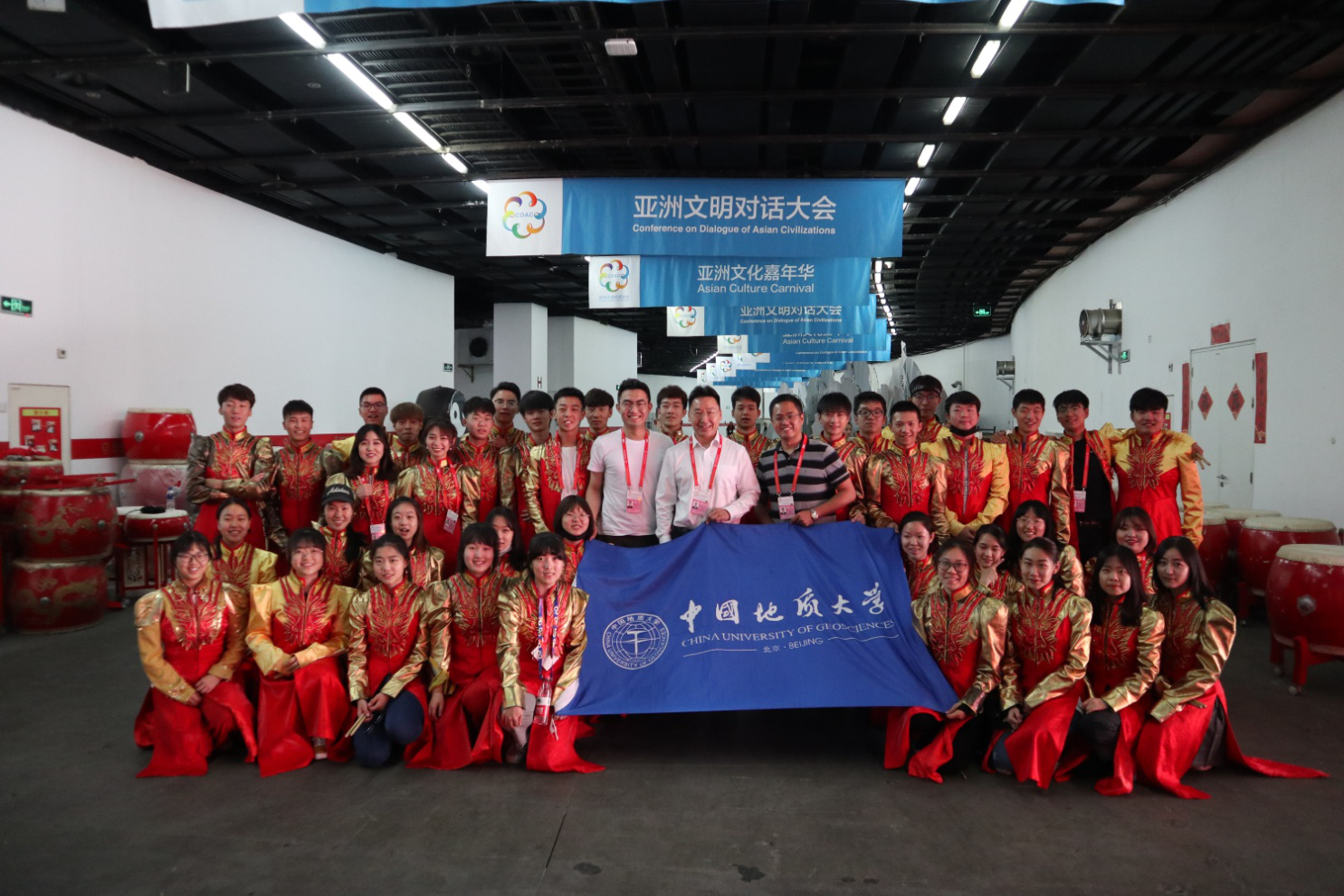 我校大学生艺术团“地质锤”打击乐团40名学生参加此次演出,与韩国、日本艺术家共同表演《鼓舞飞扬,百舸竞渡》节目。自接到选调函,乐团师生积极配合中央电视台导演组,完成节目创作、排练及演出工作。累计排练达30余天,近300小时。在鸟巢彩排的半个月时间,积极发扬地质人“艰苦朴素,求真务实”的精神,全体团员克服高强度训练的种种困难,将鼓舞节目演绎的精美绝伦。
