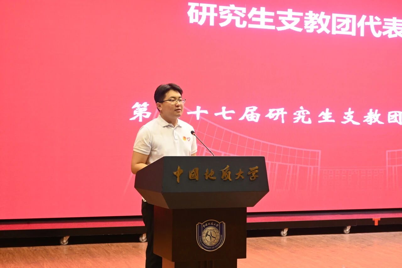 第二十七届研究生支教团成员杜明睿代表全体研支团成员进行庄严承诺:愿扎根基层一线,抱定“到西部去,到基层去,到祖国最需要的地方去”的信念,以“艰苦朴素,求真务实”的校训精神为底色,坚定“小我融入大我,青春献给祖国”的意志,把梦想的种子播撒在西部的沃土。