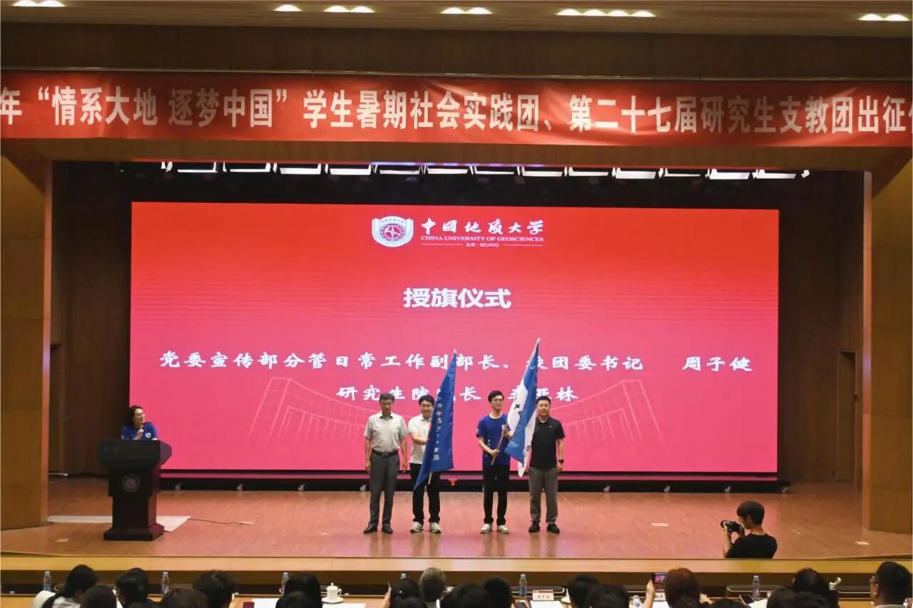 6月11日下午,中国地质大学(北京)2025年“情系大地 逐梦中国”学生暑期社会实践团、第二十七届研究生支教团出征仪式在地大国际会议中心南楼二层报告厅举行。党委副书记林善园出席,党委组织部、党委宣传部、党委学生工作部、机关与直属单位党委、研究生院、教务处、马克思主义学院有关同志,以及各学院团委书记、指导教师代表,兄弟高校实践团代表参与活动,活动由团委副书记伊然主持。