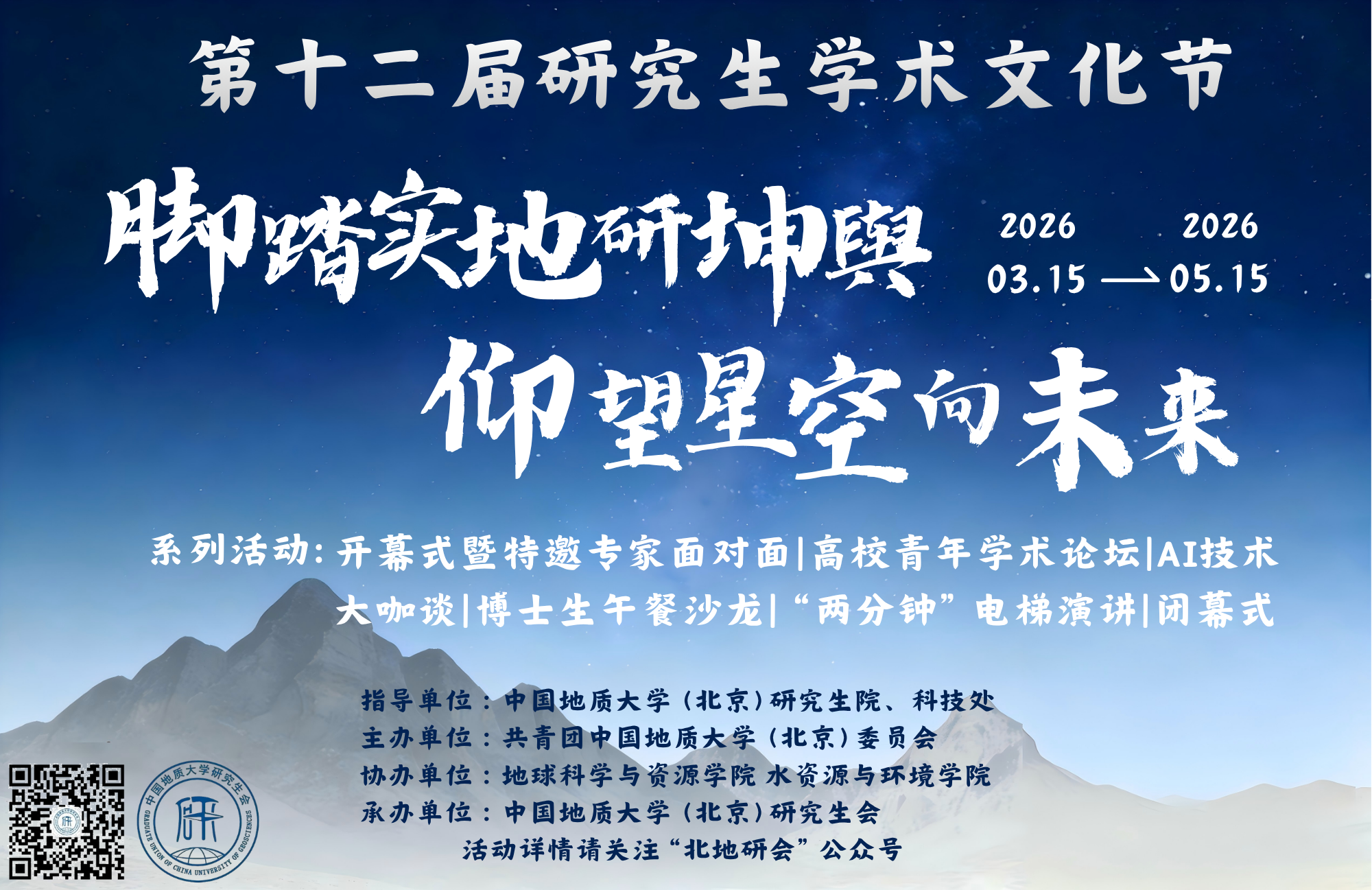 中国地质大学(北京)第十二届学术文化节,如约而至!中国地质大学(北京)研究生学术文化节是面向地大研究生的一项特色学术交流活动。学术文化节现已成功举办十一届,是活跃校园氛围、营造良好学风的重要校园文化活动!本次活动以 [脚踏实地研坤舆,仰望星空向未来] 为核心,历时两个月,设置五大篇章,共六大核心内容,为全体研究生打造一场有深度、有温度、有收获的学术盛宴。