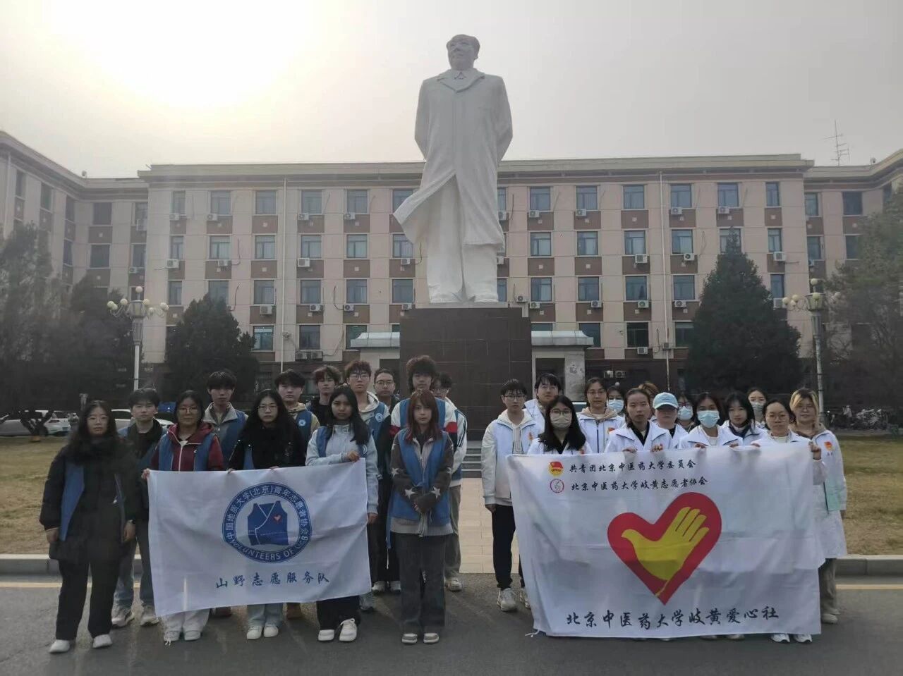 活动当日,我校志愿者在学校东门迎接北京中医药大学岐黄爱心社志愿者一行,双方合影留念后,共同前往夏日广场开展志愿服务。