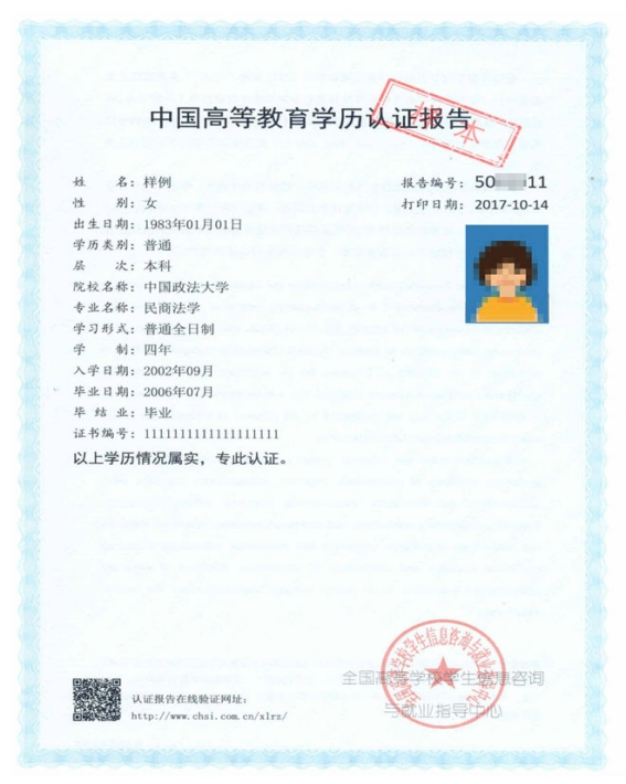 《教育部学籍在线验证报告》和《教育部学历证书电子注册备案表》样例: