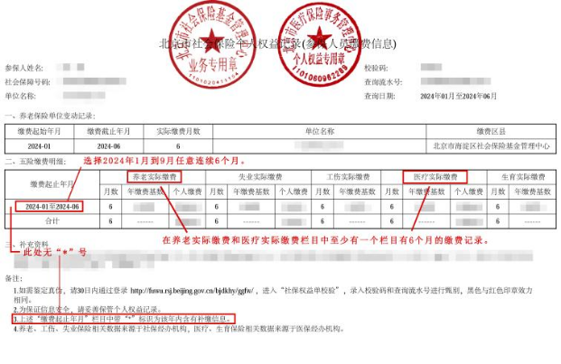 要求考生到“北京市人力资源和社会保障局官网”上查询打印,缴费起止年月选择2025年1月到2025年9月之间的任意连续6个月(如:2025.01-2025.06、2025.02-2025.07、2025.04-2025.09),上传时需对网站上下载生成的《参保人员缴费信息》PDF文件进行截图上传(文件中应带有“北京市社会保险基金管理中心业务专用章”和“北京市医疗保险事务管理中心个人权益专用章”),缴费明细部分中,缴费起止年月栏目中不能带有“*”号标识,在养老实际缴费和医疗实际缴费栏目中至少有一个栏目有6个月的缴费记录。示例如下图: