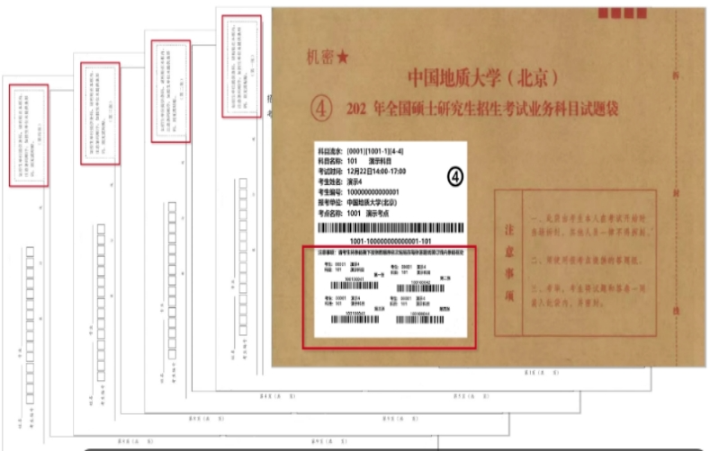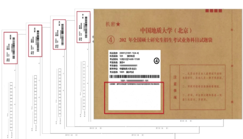 将信封下方四张小条形码(红方框内)按编号顺序粘贴在对应编号的自命题答题纸的条码粘贴区域,即:将第1、2、3、4张条形码,分别对应粘贴在第1、2、3、4张答题纸上。
